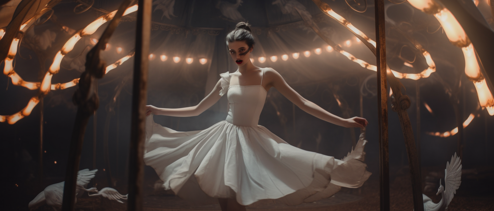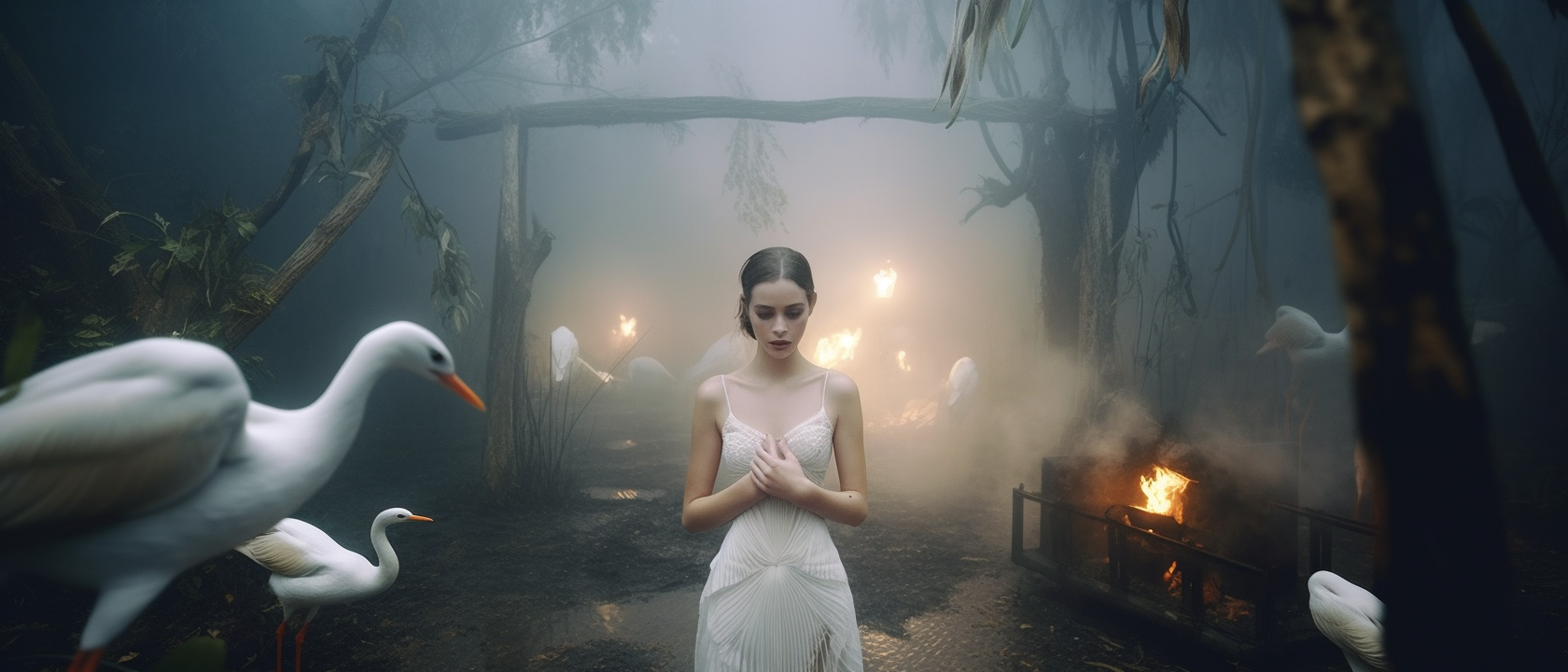 isometric Close-up, very detailed realistic photo in style of Tim Walker and Tim Burton. Portrait of young sad soviet ballerina in white lingerie dress with burning clothes dancing and burning in bright white fire on abandonned white carousel in thick overgrown tropical jungle. Light is diffused, there is heavy fog and white seaguls flying, atmosphere is serene and suspenseful. 85mm anamorphic lens, very shallow DOF --ar 21:9 --v 5 --q 2