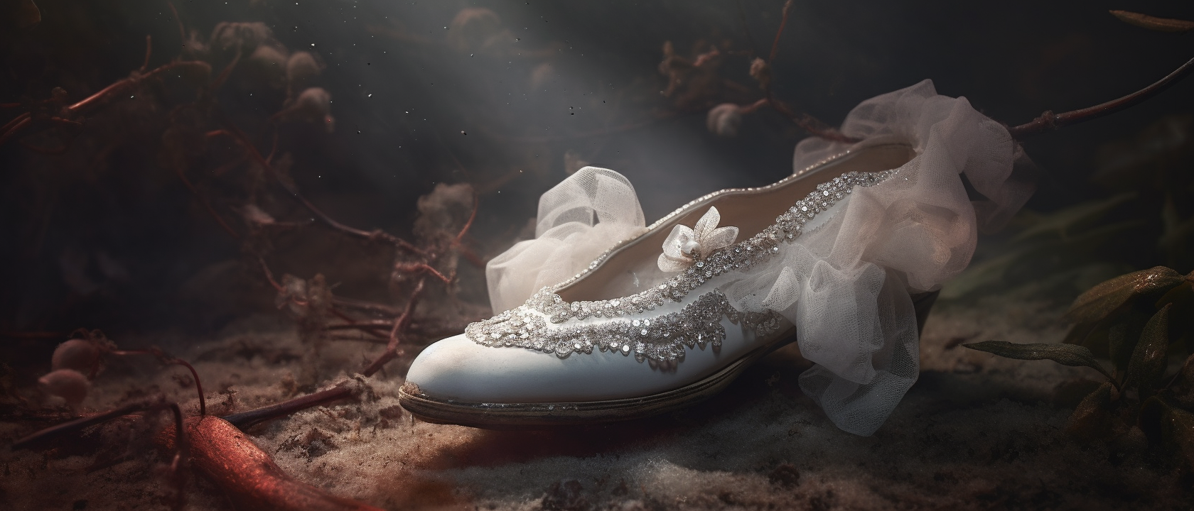 Isometric close-up, portrait very detailed realistic photo in style of Tim Walker and Tim Burton and Bruno Aveillan. Abandonned white dirty ballet pointe shoe covered in blood decorated with pearls and diamonds in dark bright white fire in abandonned white circus ruins in overgrown jungle. Light is diffused, there is heavy fog, atmosphere is serene and suspenseful. 85mm anamorphic lens, very shallow DOF --ar 21:9 --v 5 --q 2