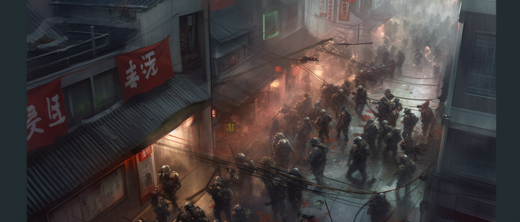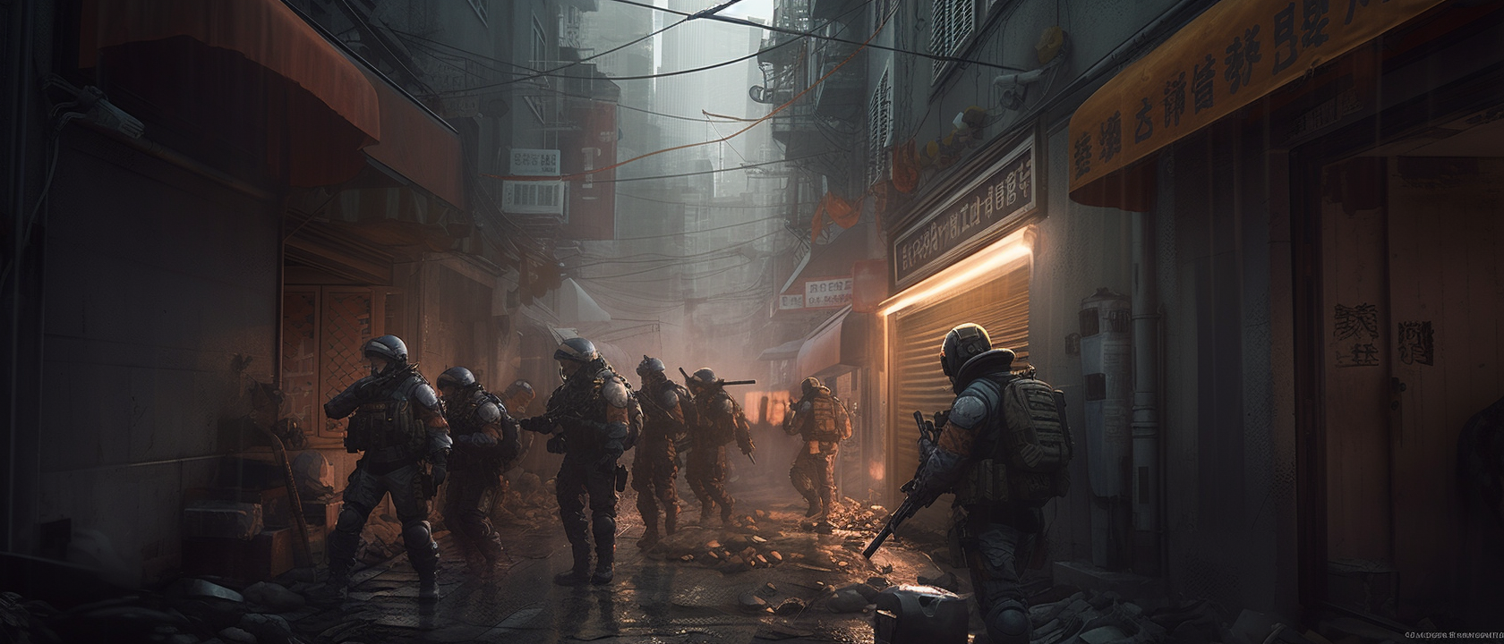 Wide angle isometric tilted anamorphic heroic shot highly detailed concept art illustration in style of Marc Simonetti. Six modern japanese SWAT soldiers fighting in crowd riot in narrow tokyo backalley with overhanging levels buildings and structures. There is riot, explosions and bullets flying. Scene is dark, it's fog and rain and backlit and there is dramatic sky with clouds. There is fog, atmosphere is dark and suspenseful. 35mm anamorphic lens, motion blur, anamorphic lens-flare --ar 21:9 --q 2 --v 5