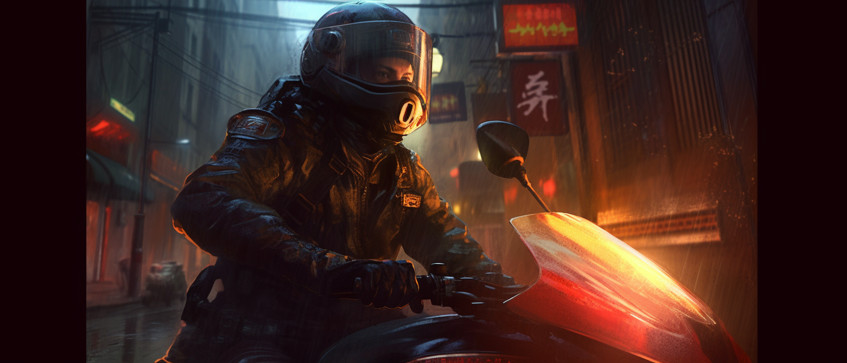 Close-up portrait anamorphic heroic shot highly detailed concept art illustration in style of Marc Simonetti. Modern japanese SWAT soldier driving fast modern super motorcycle in narrow steep back alley street in Tokyo with overhanging levels and structures. There are fires and bullets flying. Scene is dark, it's fog and rain and backlit and there is dramatic sky with clouds. There is fog, atmosphere is dark, fast and suspenseful. 35mm anamorphic lens, motion blur, anamorphic lens-flare --ar 21:9 --q 2 --v 5