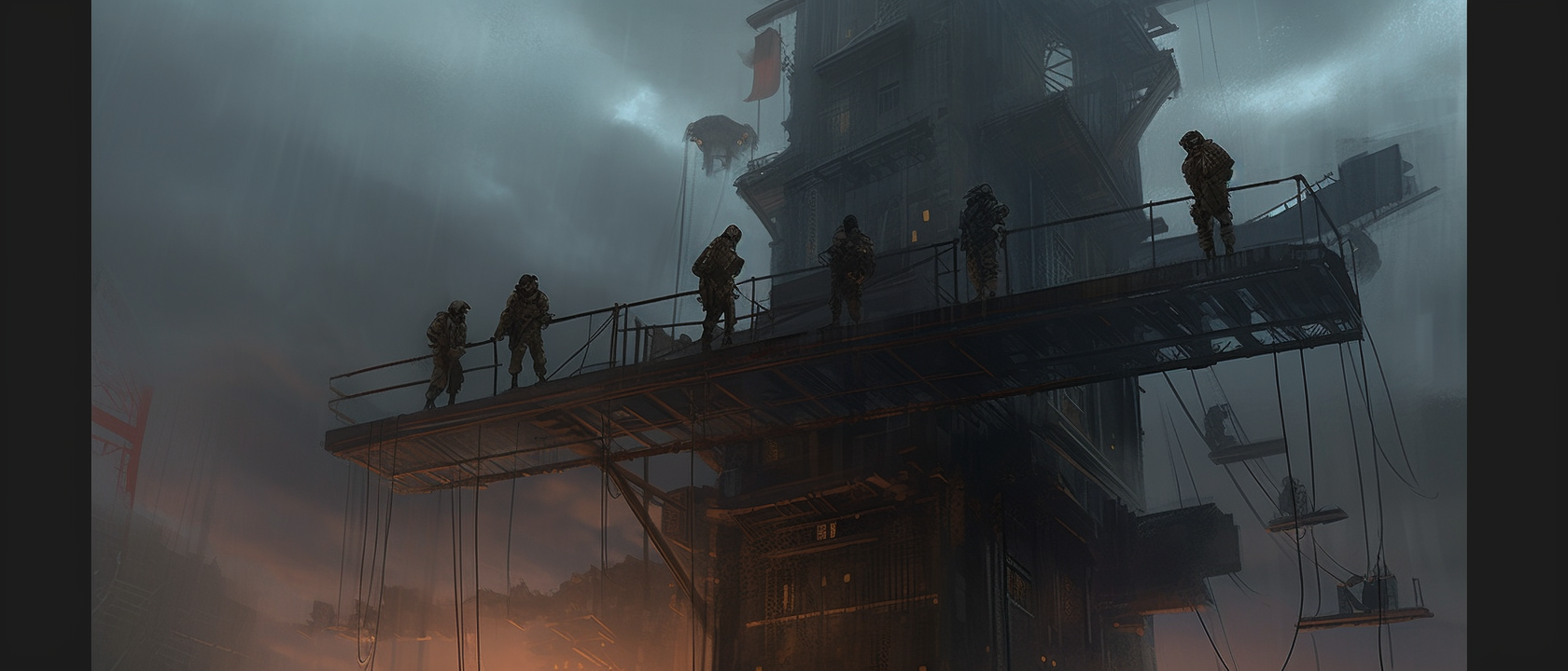 Wide angle anamorphic heroic shot highly detailed concept art illustration in style of Marc Simonetti. Six modern japanese SWAT soldiers standing on high building with overhanging levels and structures. There is riot and bullets flying. Scene is dark, it's fog and rain and backlit and there is dramatic sky with clouds. There is fog, atmosphere is dark and suspenseful. 35mm anamorphic lens, anamorphic lens-flare --ar 21:9 --q 2 --v 5